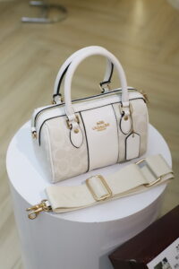Elegant white Coach bag with a wide adjustable strap.